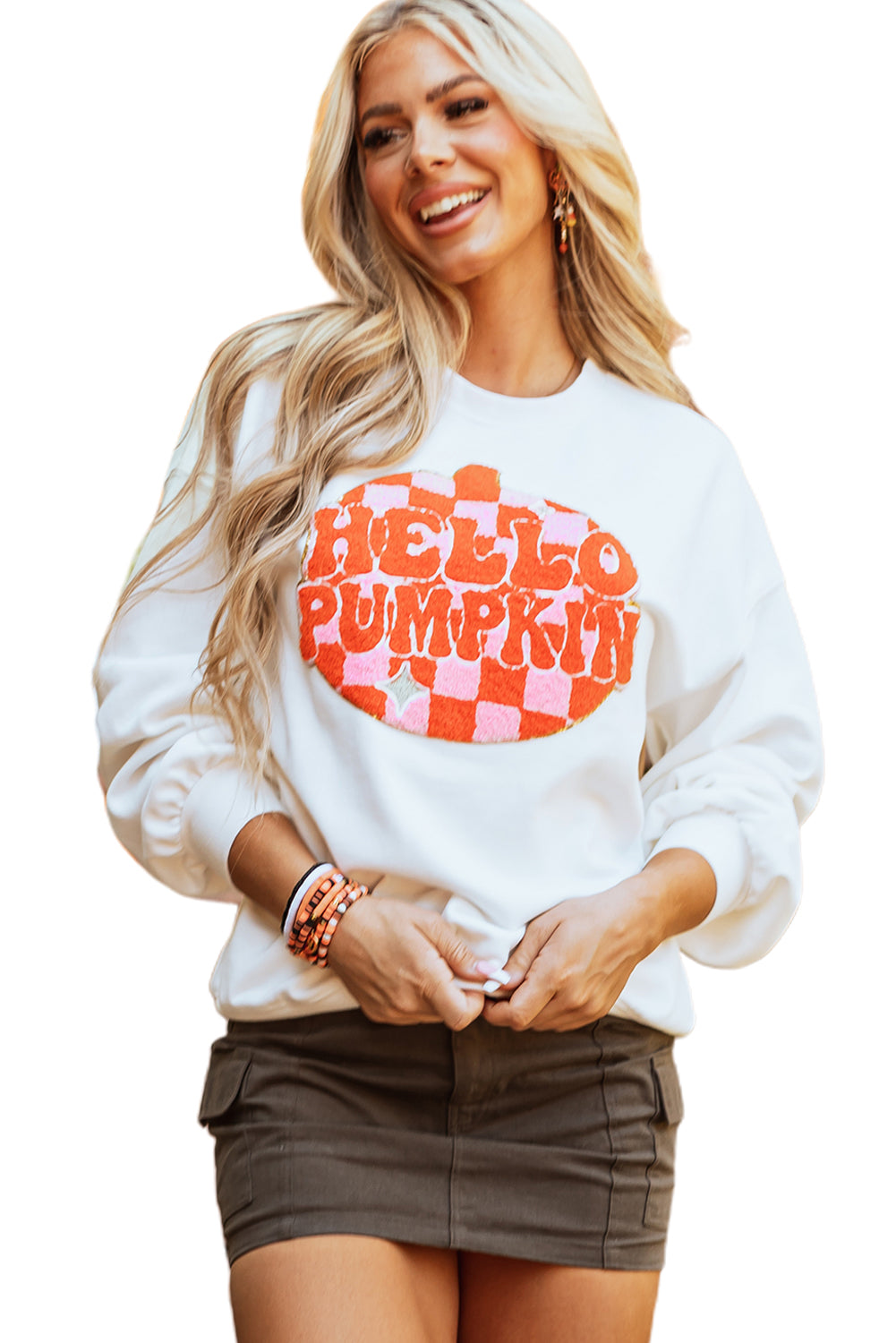 - Pumpkin and checkered chenille patches add a trendy touch.