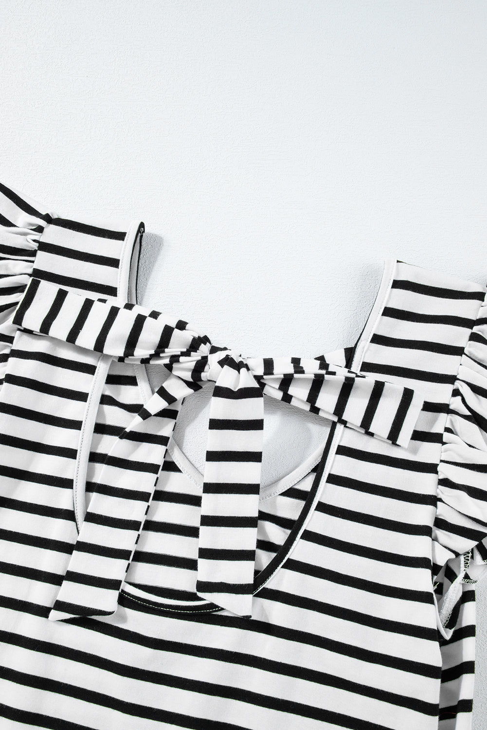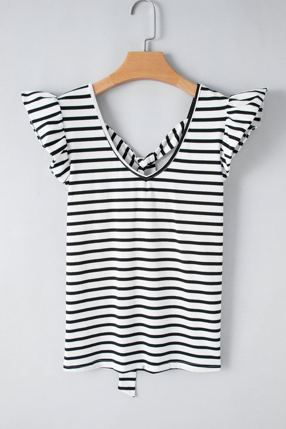 • Pink Stripe Butterfly Sleeve V Neck Hollowed Knot Back T Shirt